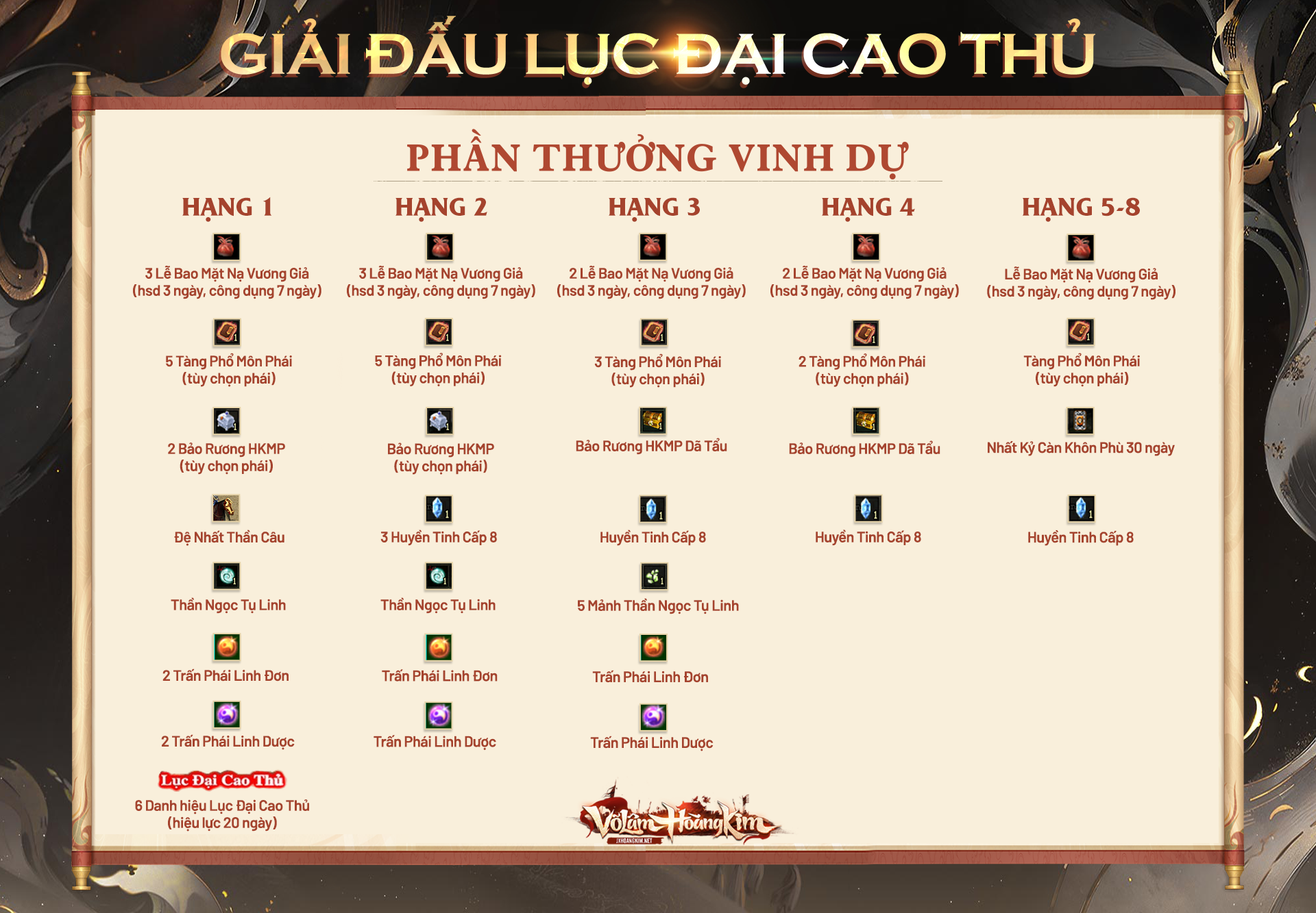 | Trao thưởng | Ngay sau khi kết thúc giải đấu, Bang Chủ đại diện liên hệ fanpage nhận thưởng |