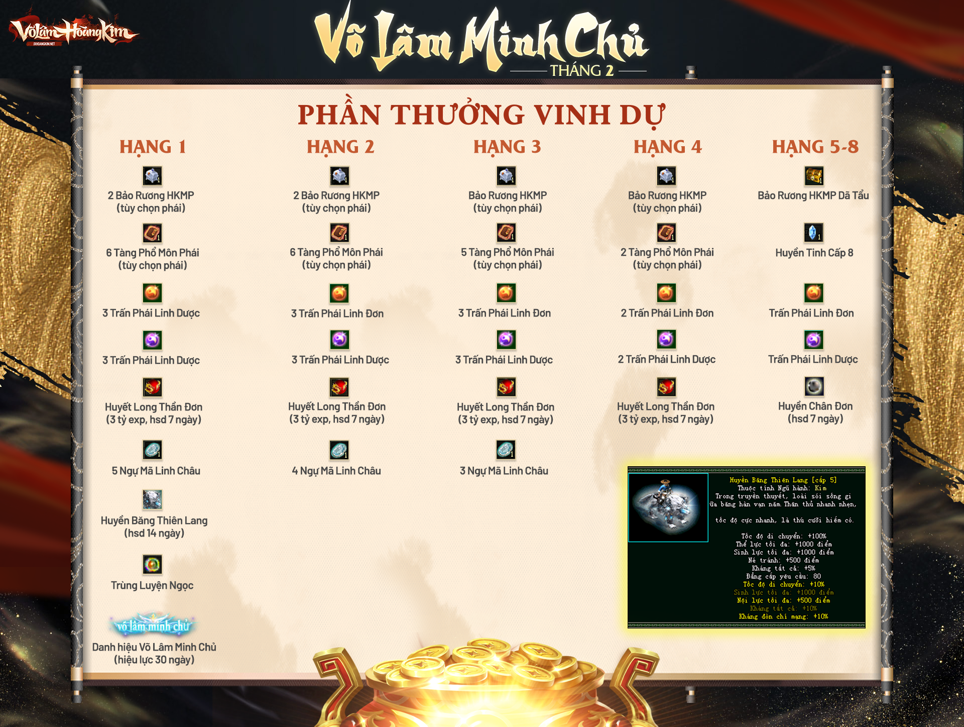 Giải đấu Võ Lâm Minh Chủ diễn ra hàng tháng tại JX Hoàng Kim, đội từ hạng 1 đến 16 bảng xếp hạng Liên Đấu sẽ tranh ngôi Minh Chủ và nhận các phần thưởng giá trị.