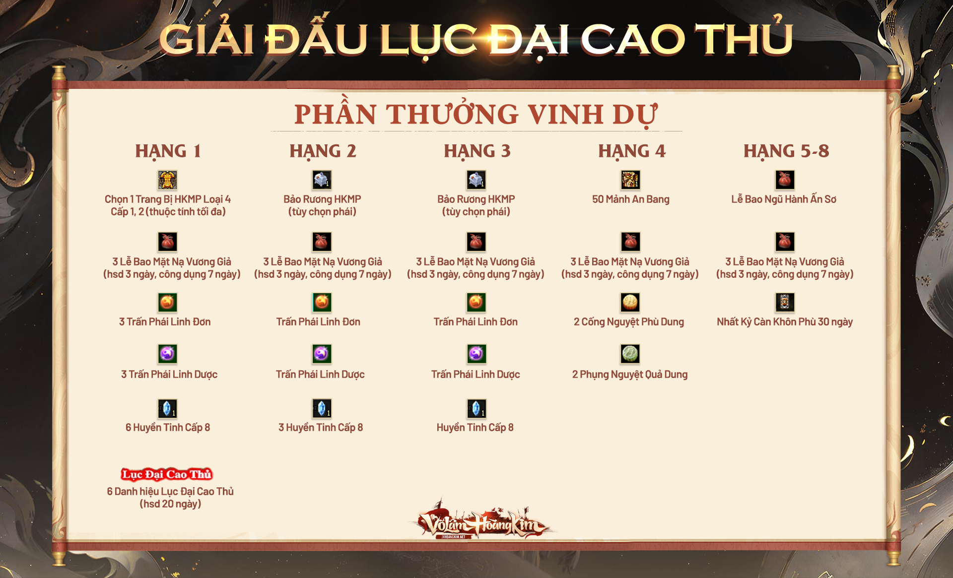 Giải đấu Lục Đại Cao Thủ liên máy chủ diễn ra hằng tháng tại JX Hoàng Kim, đây là dịp để các chiến đội đến từ các hùng bang so tài võ nghệ.